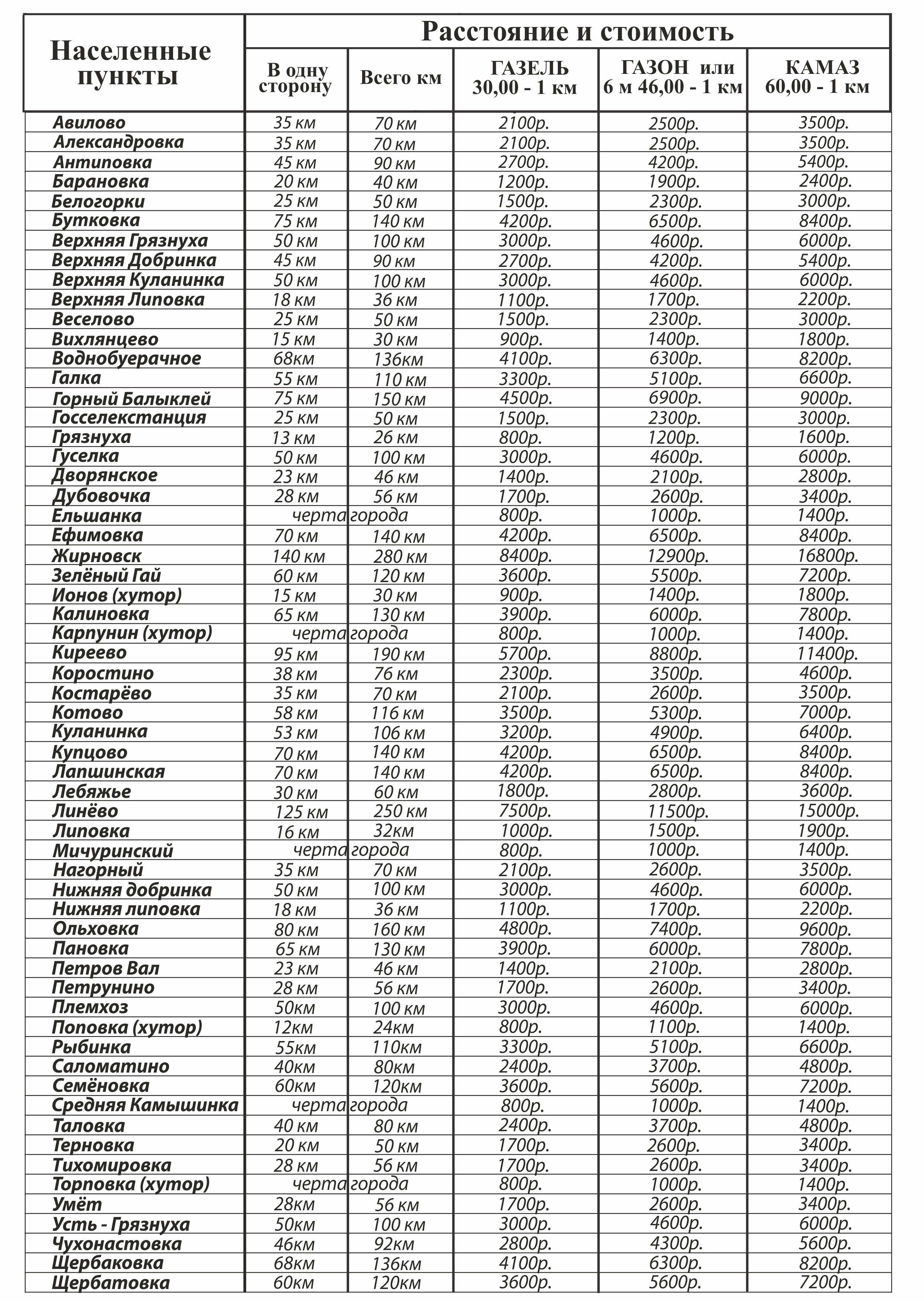 Стоимость услуг по доставке товара в районы рассчитывается из расчета 30 рублей за км. пробега в обе стороны следования автомобиля. В случае нахождения адреса доставки за пределами города Камышина, менее чем за 10 км, включительно в одну сторону расчет стоимости доставки ведется по цене доставки внутри города.
